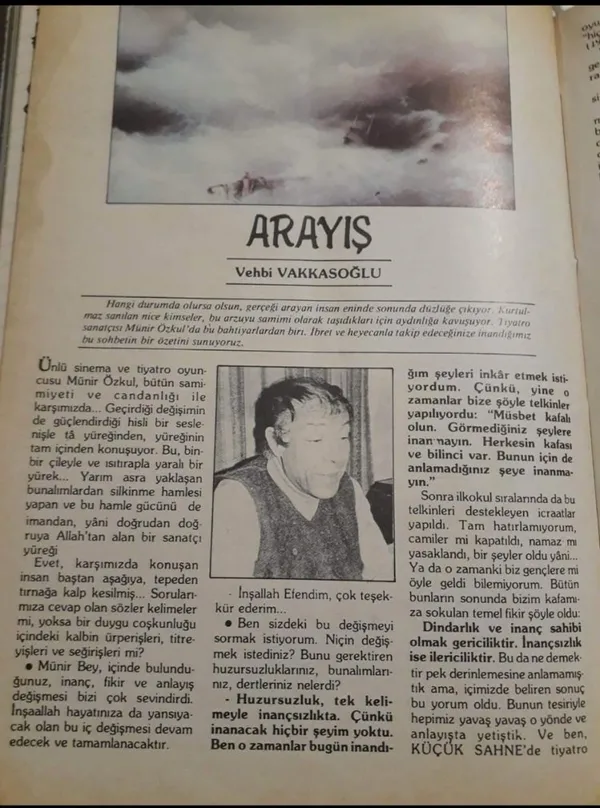 Türk sinema ve tiyatrosunun usta ismi Münir Özkul 93 yaşında hayatını kaybetti. Usta oyuncunun vefatının ardından bilinmeyen bir röportajının detayları ortaya çıktı. Özkul 1986 yılında özel bir dergiye verdiği röportajında tuvaletlerde abdestini aldığını kendi deyimiyle inkar ve karanlıktan nasıl çıktığını ve Allah inancına nasıl eriştiğini anlattı. İşte usta oyuncunun o sözleri...