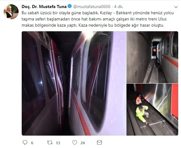 Ankara'da Kızılay-Batıkent yönünde seferler başlamadan önce hat bakım çalışması yapan iki metro kaza yaptı. Kaza nedeniyle metro seferleri durduruldu. Ankara Büyükşehir Belediye Başkanı Mustafa Tuna olay sonrası sosyal medya hesabı üzerinden açıklama yaptı.