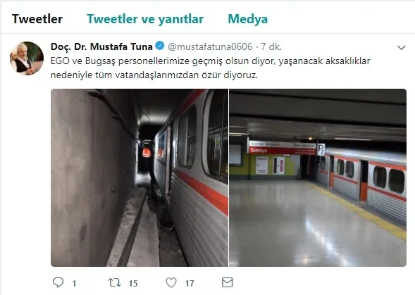 Tuna yaptığı açıklamada; "Bu sabah üzücü bir olayla güne başladık. Kızılay - Batıkent yönünde henüz yolcu taşıma seferi başlamadan önce hat bakımı amaçlı çalışan iki metro treni Ulus makas bölgesinde kaza yaptı. Kaza nedeniyle bu bölgede ağır hasar oluştu. Hasar ve durum tesbit çalışmalarının ardından hemen tamir çalışmalarına başlandı. İvedik - Kızılay istasyonları arasında kaza nedeniyle metro hattı çalışamayacak olup; bu hattaki yolcu transferleri EGO otobüslerimiz vasıtasıyla gerçekleşecektir. EGO ve Bugsaş personellerimize geçmiş olsun diyor, yaşanacak aksaklıklar nedeniyle tüm vatandaşlarımızdan özür diyoruz." dedi.