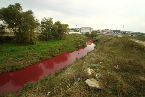 Tamamen pembe ve kırmızı renge bürünen dere çevre kirliliğini gözler önüne serdi.