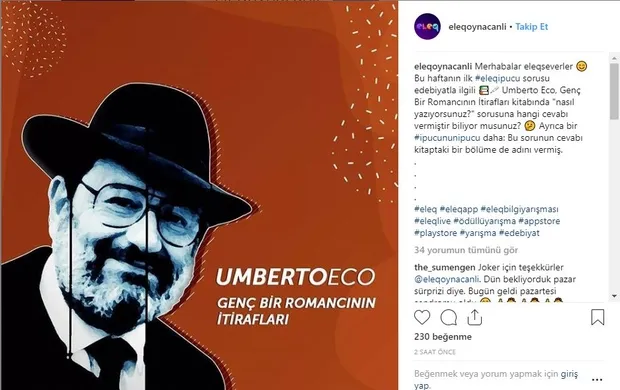 Eleq instagram hesabından ipucu sorusu ile ilgili açıklama geldi. Yapılan açıklamada, "Merhabalar eleqseverler... Bu haftanın ilk #eleqipucu sorusu edebiyatla ilgili... Umberto Eco, Genç Bir Romancının İtirafları kitabında "nasıl yazıyorsunuz?" sorusuna hangi cevabı vermiştir biliyor musunuz? Ayrıca bir #ipucununipucu daha: Bu sorunun cevabı kitaptaki bir bölüme de adını vermiş." denildi. Peki, Umberto Eco Genç Bir Romancının İtirafları kitabında 'nasıl yazıyorsunuz' sorusuna hangi yanıtı vermiştir? İşte eleq ipucu cevabı...