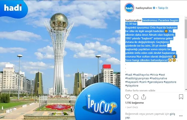 Hadi instagram hesabından yapılan açıklamada, "Sendromsuz Pazartesi bugün 12.30'da! Bugünkü ipucumuz Orta Asya'da bulunan bir ülke ile ilgili sevgili hadiciler. Bu ülkenin daha önce Almatı olan başkenti, 1997 yılında "başkent" anlamına gelen Astana ile değiştirilmişti. Geçtiğimiz günlerde ise bu isim, 28 yıl devlet başkanlığı yaptıktan sonra sürpriz bir şekilde istifa eden eski devlet başkanının onuruna Nur-sultan olarak değiştirildi. Sizce hangi ülkeden bahsediyoruz?" denildi.