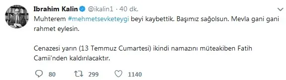 Sözcü Kalın, yaptığı paylaşımda "Muhterem #mehmetsevketeygi beyi kaybettik. Başımız sağolsun. Mevla gani gani rahmet eylesin. Cenazesi (13 Temmuz Cumartesi) ikindi namazını müteakiben Fatih Camii'nden kaldırılacaktır." ifadesini kullandı.