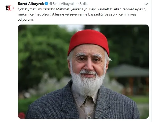 Hazine ve Maliye Bakanı Berat Albayrak ise paylaştığı taziye mesajında, "Çok kıymetli mütefekkir Mehmet Şevket Eygi Bey'i kaybettik. Allah rahmet eylesin, mekanı cennet olsun. Ailesine ve sevenlerine başsağlığı ve sabr-ı cemil niyaz ediyorum." dedi.