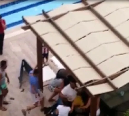 Antalya'da bir sitede yaşayan Hatice D.(40) ve nişanlısı Osman Erdoğan (48), havuz başında çıkan kavgada aynı aileden 10 kişi tarafından dövüldü. Aldığı darbeler nedeniyle bayılan Hatice D. ile nişanlısını korumak için üzerine yatan Osman Erdoğan'ı öfkeli ailenin elinden polis kurtardı. Dayak anı sitenin güvenlik kamerasına yansıdı.