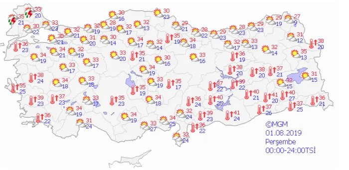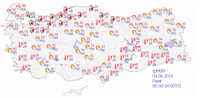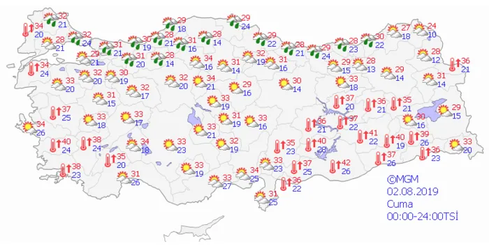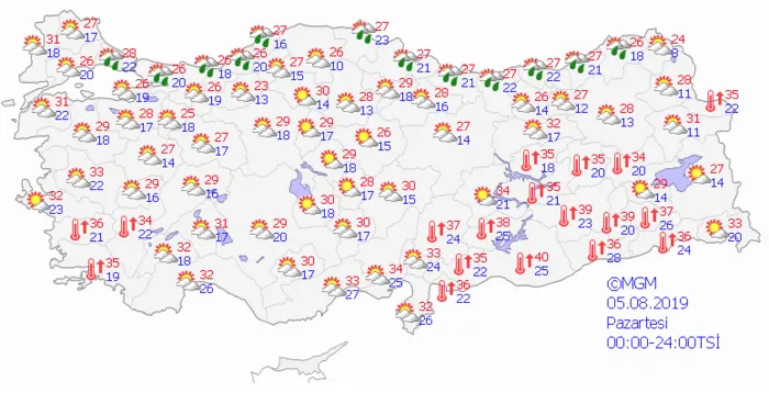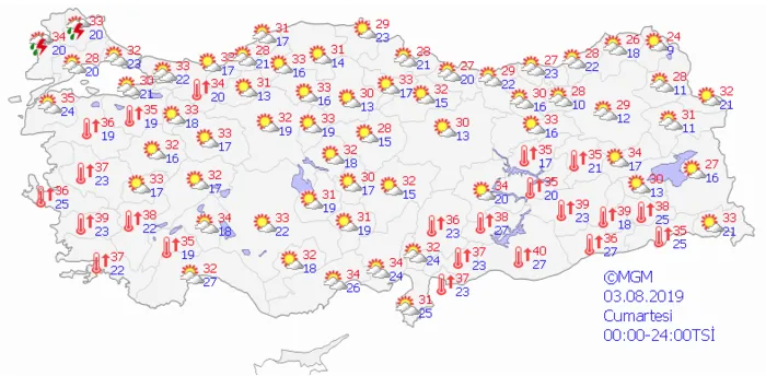 1 Ağustos 2019 Perşembe günü için Meteoroloji'den son dakika hava durumu uyarısı geldi. Yurt genelinde hava açık olacağı beklenirken sıcaklıklar mevsim normallerinde seyredecek. Ankara ve İstanbul 33, İzmir ise 35 dereceyi görecek. Uzmanlar öğle saatlerinde vatandaşların dışarıda olmamaları konusunda uyarı yaptı. Vatandaşların internette aradığı İstanbul'da hava nasıl olacak? Ankara'da hava nasıl olacak? İzmir'de hava nasıl olacak? Bugün hava nasıl olacak? sorularının cevabı haberin detayında. İşte 1 Ağustos 2019 Perşembe hava durumu tahminleri...