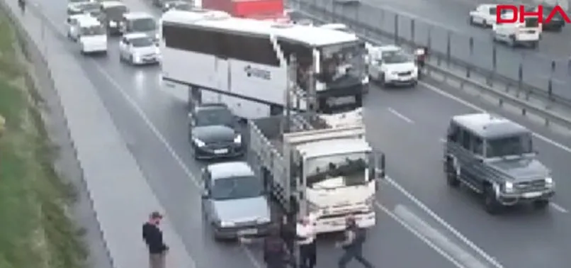 Başakşehir'de kamyonet ile otomobil sürücüleri arasında iddiaya göre yol verme meselesinden tartışma çıktı. Yolun ortasında durdurdukları araçlarından iki sürücü, birbirleriyle kavga etmeyen başladı.