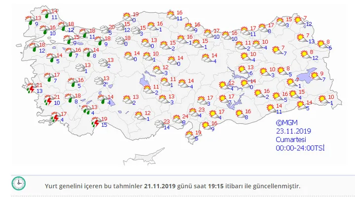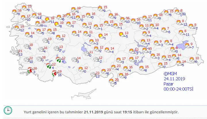 Meteoroloji Genel Müdürlüğü tarafından yapılan son değerlendirmelere göre; Yurdun batı kesimlerinin parçalı zamanla çok bulutlu, akşam saatlerinden itibaren Edirne, Balıkesir'in batısı, Çanakkale, Kuzey Ege kıyıları ve Manisa çevreleri ile İzmir, Aydın ve Muğla'nın kıyı kesimlerinin sağanak ve yer yer gök gürültülü sağanak yağışlı, diğer yerlerin az bulutlu ve açık geçeceği tahmin ediliyor.