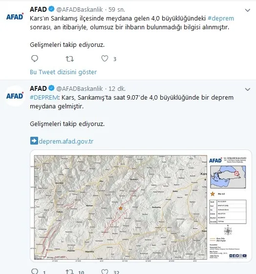 Son dakika haberine göre Kars’ın Sarıkamış ilçesinde aynı dakika içerisinde ikisi de Richter ölçeğine 4.0 büyüklüğünde olan iki deprem meydana geldi. Depremlerde can ve mal kaybı yaşanmadı.