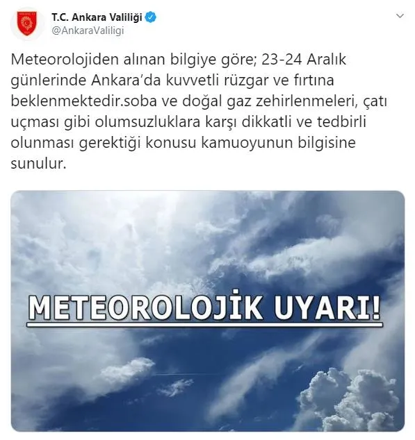Ankara Valiliğinin Twitter hesabından yapılan açıklamada, "Meteorolojiden alınan bilgiye göre; 23-24 Aralık günlerinde Ankara' da kuvvetli rüzgar ve fırtına beklenmektedir. Soba ve doğal gaz zehirlenmeleri, çatı uçması gibi olumsuzluklara karşı dikkatli ve tedbirli olunması gerektiği konusu kamuoyunun bilgisine sunulur." denildi.
