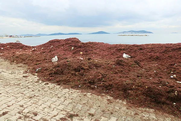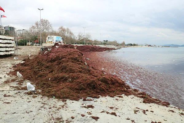 İstanbul'daki lodos nedeniyle nedeniyle kırmızı yosunlar sahile vurdu. Yosunlar nedeniyle Caddebostan'dan Maltepe'ye kadar uzanan sahil kızıla boyandı. Kırmızı renkli yosunlar, kayalıkların üzerini de kaplayan yosunlar havadan da fotoğraflandı.