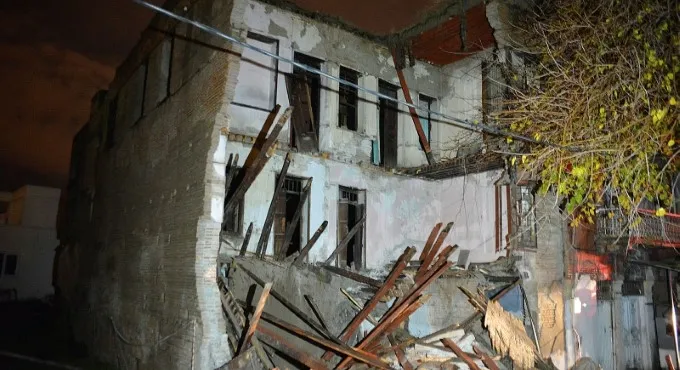 Merkez Seyhan ilçesinin tarihi yapılarıyla ünlü Tepebağ Mahallesi'nde gece yarısı büyük bir gürültüye uyanan mahalle sakinleri, dışarıya çıktıklarında 27011 Sokak'ta bulunan terk edilmiş 3 katlı binanın yıkıldığını gördü.