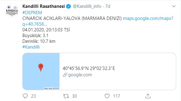 Boğaziçi Üniversitesi Kandilli Rasathanesi ve Deprem Araştırma Enstitüsü'nün aktardığı son dakika bilgisine göre, saat 20.13'te Marmara Denizi'nde Yalova açıklarında 3.1 şiddetinde bir deprem meydana geldi. Deprem Yalova ve İstanbul'dan da hissedildi.