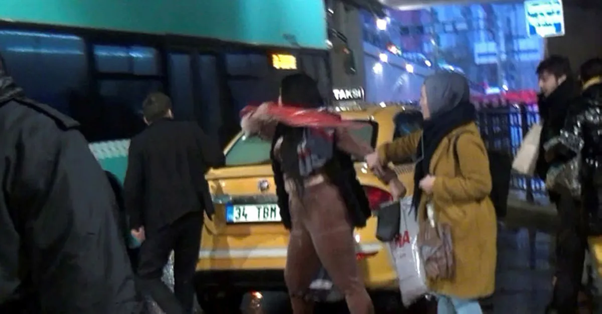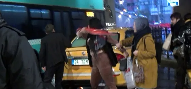 Tartışmanın kavgaya dönüşmesi üzerine kadın elindeki şemsiyeyle taksiciye vurdu. Duruma sinirlenen taksici de kadına tekme attı. Vatandaşların araya girmesine rağmen sakinleşmeyen taraflar arasında çıkan arbede bir süre daha devam etti. Polis ekiplerinin kısa sürede olay yerine gelmesinin ardından kadınlar meydandaki polis noktasına götürüldü.
