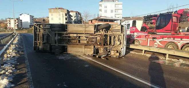 Kenan Taşdemir (40) yönetimindeki 52 AAP 388 servis midibüsü, Yunus Emre Mahallesinde buzlanma nedeniyle kontrolden çıkarak devrildi.
