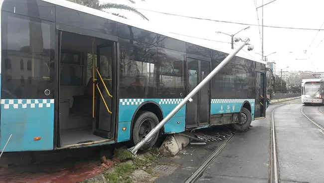 Taksim - Yenibosna hattı üzerinde çalışan özel halk otobüsü virajı alamayarak kaza yaptı. Önce ışıklara ve MOBESE direğine çarpan otobüs tramvay hattına girdi. Otobüste yolcu olmaması faciayı önledi.