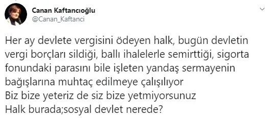 Akşam saatlerinde "Dayanışacak ve hep birlikte başaracağız Az çok demeden gücümüz ölçüsünde dayanışmaya #SenDeVarMısın Hep birlikte büyütelim dayanışmayı" ifadeleriyle maddi destek isteyen Canan Kaftancıoğlu, Başkan Erdoğan'ın kampanyayı başlatmasının ardından "Her ay devlete vergisini ödeyen halk, bugün devletin vergi borçları sildiği, ballı ihalelerle semirttiği, sigorta fonundaki parasını bile işleten yandaş sermayenin bağışlarına muhtaç edilmeye çalışılıyor Biz bize yeteriz de siz bize yetmiyorsunuz Halk burada;sosyal devlet nerede?" paylaşımında bulundu.
