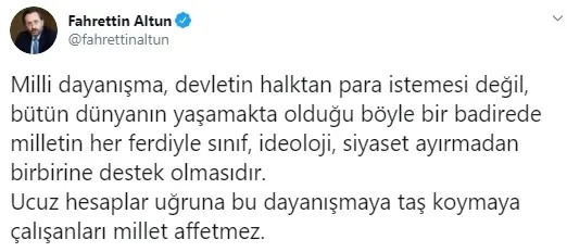 Koronavirüsle mücadelede Türkiye'nin her ferdi ile bütünleştiğini belirten Altun, "Milli dayanışma, devletin halktan para istemesi değil, bütün dünyanın yaşamakta olduğu böyle bir badirede milletin her ferdiyle sınıf, ideoloji, siyaset ayırmadan birbirine destek olmasıdır. Ucuz hesaplar uğruna bu dayanışmaya taş koymaya çalışanları millet affetmez." ifadelerine yer verdi.