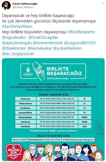 CHP İstanbul İl Başkanı Canan Kaftancıoğlu, saat 20.19'da Twitter hesabından bir paylaşımda bulundu. Koronavirüsle mücadele kapsamında banka hesapları paylaşarak maddi destek isteyen Canan Kaftancıoğlu, Başkan Erdoğan'ın başlattığı 'Milli Dayanışma Kampanyası'nı hedef aldı.
