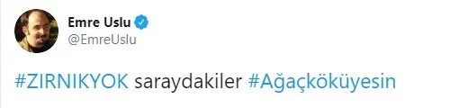 FETÖ firarisi Emre Uslu da Türk milletinin koronavirüsle mücadeledeki tutumunu hazmedemeyenlerden oldu. Uslu da yoksul ailelere destek için başlatılan kampanya karşısında "#ZIRNIKYOK saraydakiler #Ağaçköküyesin" ifadelerine yer verdi.