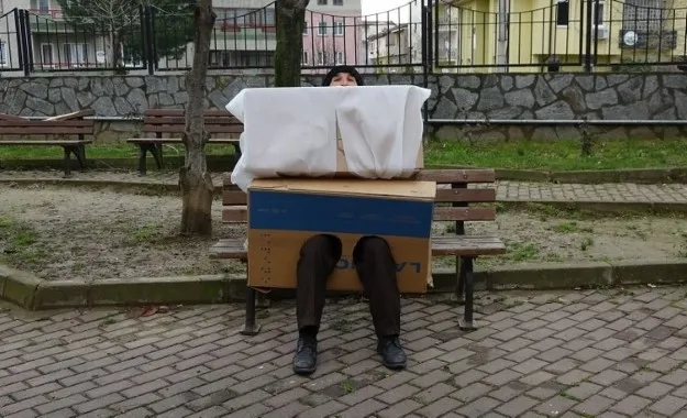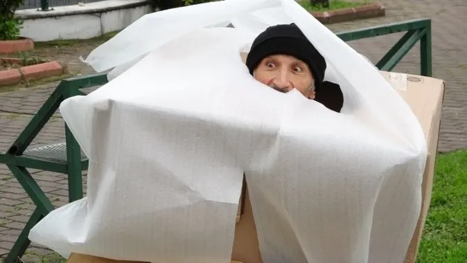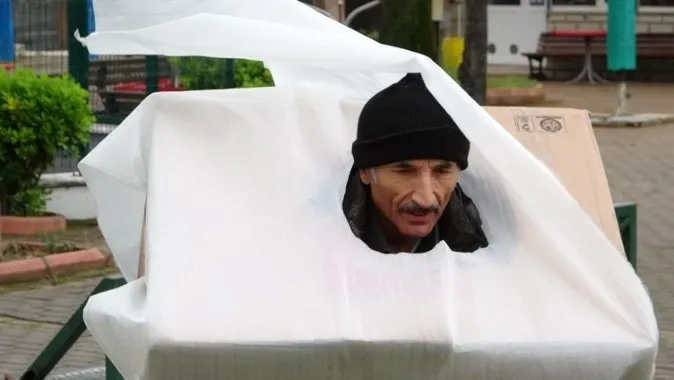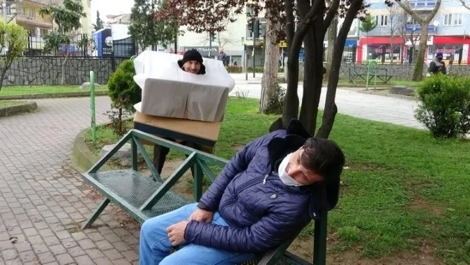 Sosyal mesaj vermeye çalışırken korkuttuğu vatandaşlar tarafından darp edilen adam, şimdi de koronavirüs mesajı vermek için kolilerden yaptığı kostümle vatandaşı korkuttu.