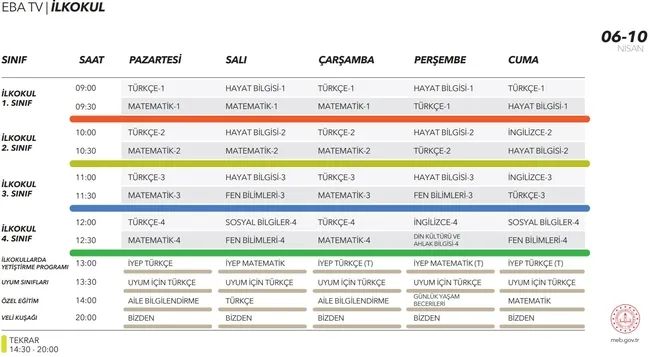 EBA TV İlkokul ders tekrar saatleri: 14.30 - 20.00