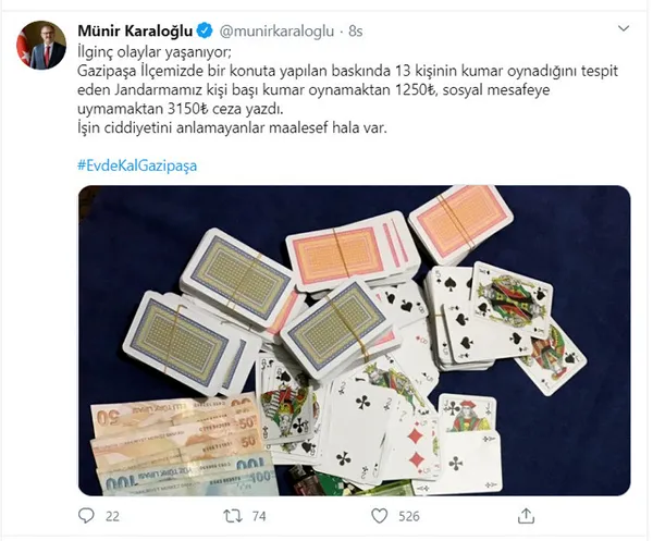Antalya Valisi Münir Karaloğlu, sosyal medya hesaplarından yaptığı paylaşımda, "İlginç olaylar yaşanıyor. Gazipaşa ilçemizde bir konuta yapılan baskında 13 kişinin kumar oynadığını tespit eden jandarmamız kişi başı kumar oynamaktan 1250 TL, sosyal mesafeye uymamaktan 3 bin 150 TL ceza yazdı. İşin ciddiyetini anlamayanlar maalesef hala var" dedi. Karaloğlu paylaşımında 'Evde kal Gazipaşa' çağrısında da bulundu ve kumar oynayanlarla birlikte ele geçirilen nakit para ve oyun gereçlerinin fotoğrafını paylaştı.