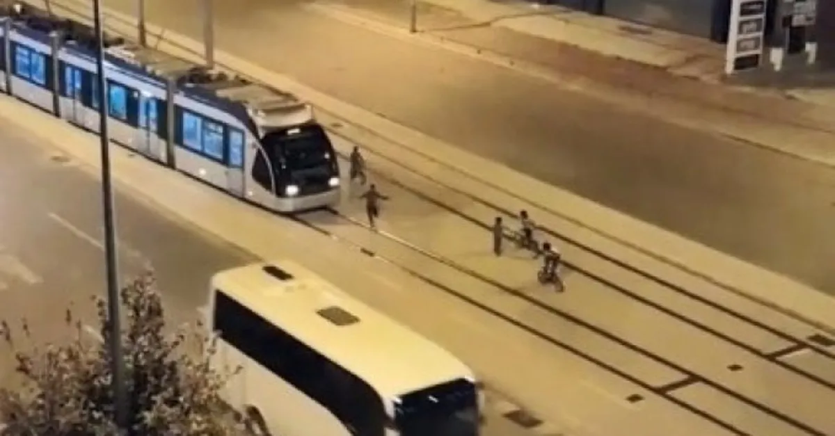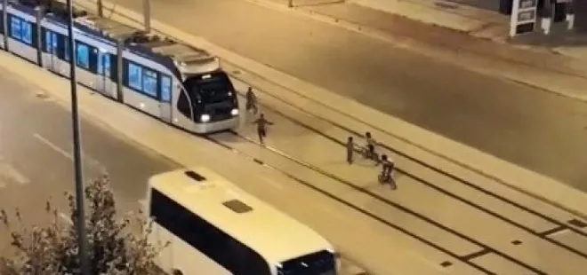Çocuklardan biri şehir merkezi istikametine ilerleyen tramvayın önüne aniden atlayıp yürekleri ağza getirirken, bir süre de önünde durdu. Vatmanın çaldığı sirene aldırış etmeyen çocuklar bir süre tramvayın ilerlemesini engelledi.