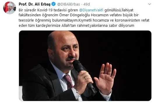 "Bir süredir Kovid-19 tedavisi gören Diyanet Vakfı gönüllüsü, ilahiyat fakültesinden öğrencim Ömer Döngeloğlu hocamızın vefatını büyük bir teessürle öğrenmiş bulunmaktayım. Kıymetli hocamıza ve koronavirüsten vefat eden tüm kardeşlerimize Allah'tan rahmet, yakınlarına sabır diliyorum."