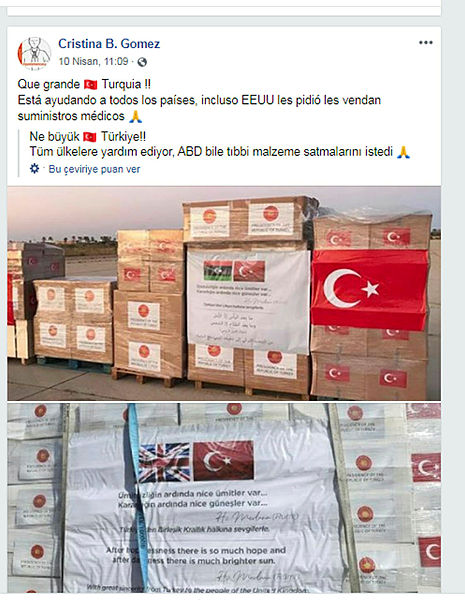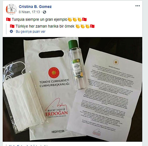 İspanyol vatandaşı Cristina Gomez ise sosyal medya hesabından Türkiye'ye teşekkür ederek "Ne büyük Türkiye. Tüm ülkelere yardım ediyor. ABD bile tıbbi malzeme satmalarını istedi. Türkiye, ülke çapında maske satışını yasakladı ve halkına ücretsiz dağıtıyor. Bu duyuruyu Recep Tayyip Erdoğan yaptı. Para için maske satmak yasak. Türkiye her zaman harika bir örnek" dedi.
