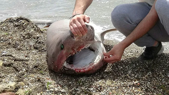 Çanakkale’de 'altıyarıklı canavar' olarak da bilinen boz camgöz köpek balığı, ölü olarak yeni kordon sahiline vurdu. Kumsalda köpek balığını gören vatandaşlar, şaşkınlık yaşadı.