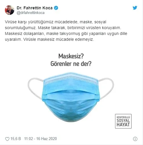 Sağlık Bakanı Fahrettin Koca, sosyal medya hesabı Twitter üzerinden maske kullanımı konusunda son dakika açıklaması yaptı. Bakan Koca maske takmayanların uyarılması konusuna dikkat çekti.