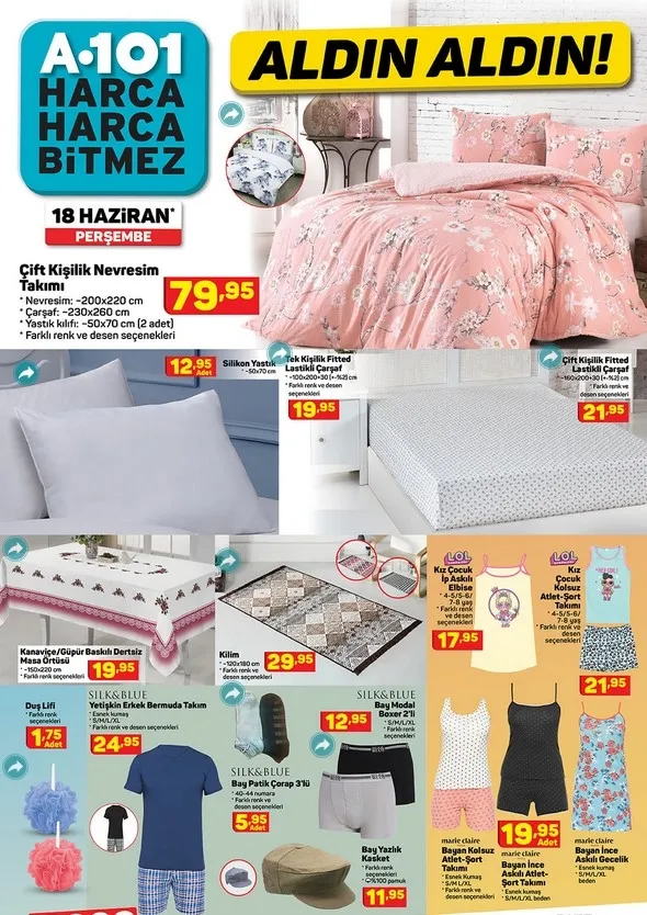Silk&Blue Yetişkin Erkek Bermuda Takım 24,95 TL. Silk&Blue Bay Patik Çorap 5,95 TL. Silk&Blue Bay Modal Boxer 12,95 TL. Farklı renk seçeneklerine sahip, pamuktan üretilmiş Bay Yazlık Kasket 11,95 TL. Bayan Kolsuz Atlet-Şort Takımı 19,95 TL. Bayan İnce Askılı Gecelik 19,95 TL. Kız Çocuk Kolsuz Atlet-Şort Takımı 21,95 TL. Kız Çocuk İp Askılı Elbise 17,95 TL. Farklı renk ve desen seçenekleri ile satışa sunulan Kilim 29,95 TL. Kanaviçe, Güpü Baskılı Dertsiz Masa Örtüsü 19,95 TL. Silikon Yastık 12,95 TL. Çift Kişilik Nevresim Takımı 79,95 TL. Tek Kişilik Fitted Lastikli Çarşaf 19,95 TL. A101 18 Haziran aktüel ürünler kataloğu ile ayrıca çok sayıda züccaciye ürünü siz müşterilerin beğenisine sunuluyor olacak.
