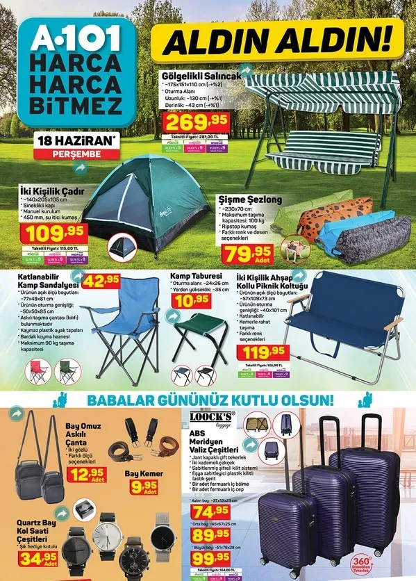 Manuel kurulumlu, sineklikli kapıya sahip, su itici kumaştan üretilmiş İki Kişilik Çadır 109,95 TL. Farklı renk ve desen seçeneklerine sahip 100kg taşıma kapasiteli Şişme Şezlong 79,95 TL. Gölgelikli Salıncak 269,95 TL. Katlanabilir Kamp Sandalyesi 42,95 TL. Kamp Taburesi 10,95 TL. İki Kişilik Ahşap Kollu Piknik Koltuğu 119,95 TL. Bay Omuz Askılı Çanta 12,95 TL. Bay Kemer 9,95 TL. Şık hediye kutusuna sahip Quartz Bay Kol Saati çeşitleri 34,95 TL. Loock's Büyük Boy Valiz 99,95 TL. 4 Raflı Çok Amaçlı Dolap 179 TL. Opak beyaz rengi ile dikkat çeken, 3'lü Zigon Sehpa 89,95 TL. Katlanabilir Masa 75 TL. Yer Sofrası 45 TL. Hamur Leğeni 6,95 TL. Rooc Hamur Şekillendirici Rulo 4,95 TL. Duş Seti 14,95 TL. Ahşap Figürlü Kapı Stoperi 2,95 TL. Çok Amaçlı Çocuk Sehpası 14,95 TL.