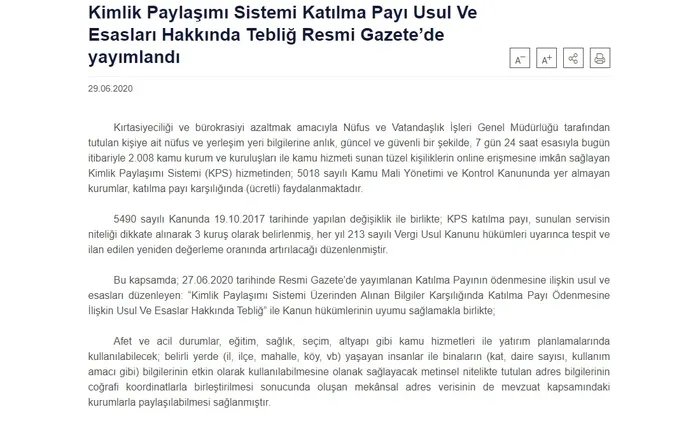 "Kırtasiyeciliği ve bürokrasiyi azaltmak amacıyla Nüfus ve Vatandaşlık İşleri Genel Müdürlüğü tarafından tutulan kişiye ait nüfus ve yerleşim yeri bilgilerine anlık, güncel ve güvenli bir şekilde, 7 gün 24 saat esasıyla bugün itibariyle 2.008 kamu kurum ve kuruluşları ile kamu hizmeti sunan tüzel kişiliklerin online erişmesine imkân sağlayan Kimlik Paylaşımı Sistemi (KPS) hizmetinden; 5018 sayılı Kamu Mali Yönetimi ve Kontrol Kanununda yer almayan kurumlar, katılma payı karşılığında (ücretli) faydalanmaktadır.