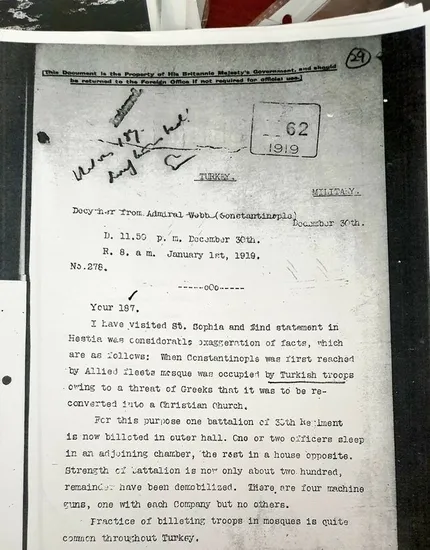 İngiliz arşivlerinde yer alan bu mektupta İstanbul'a ilk gelen İngiliz işgal kuvvet kumandanlığının gözlemi yer alıyor. Mektupta Ayasofya'nın tekrar kilise olmasın diye 200 kişilik bir kuvvet tarafından korunduğu bilgisine yer verilirken, camileri koruyan askerlere sık sık rastlanıldığının altı çiziliyor.