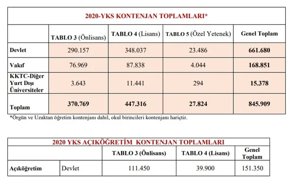 Ülkenin ihtiyacı, istihdam imkânları, yükseköğretim kurumlarının kapasitesi, öğrenci temayülleri ve yükseköğretimde niteliği artırma önceliği ve benzeri dikkate alınan çok sayıda parametre doğrultusunda (uzaktan öğretim dahil, olmak üzere), önlisans ve lisans düzeyinde örgün öğretim programları için 2019 yılında 834 bin 509 kontenjan belirlenmiş idi. Bu yıl ise örgün programlar için (uzaktan öğretim dahil, okul birincisi kontenjanları hariç olmak üzere) belirlenen toplam kontenjan 845 bin 909 oldu. 2020 Yükseköğretim Kurumları Sınavı'nda (YKS) örgün programlarda: Devlet üniversitelerinde okul birincisi kontenjanları hariç 282 bin 402 ön lisans, 345 bin 997 lisans, 23 bin 486 özel yetenek olmak üzere toplam 651 bin 885 kontenjan ayrıldı. Vakıf yükseköğretim kurumlarında 76 bin 268 ön lisans, 87 bin 838 lisans, 4 bin 44 özel yetenek olmak üzere toplam 168 bin 150, KKTC ve diğer üniversitelerde 3 bin 643 ön lisans, 11 bin 211 lisans, 294 özel yetenek olmak üzere toplam 15 bin 148 kontenjan verildi. Devlet Üniversitelerinde örgün programların kontenjanları geçen seneye göre aynı düzeyde kalmış iken vakıf üniversitelerinde kontenjanlar kayda değer bir oranda artmıştır. Buna göre; örgün programlarda ön lisansta 362 bin 313, lisansta 445 bin 246, özel yetenekte 27 bin 824 olmak üzere toplamda 835 bin 383 kontenjan bulunmaktadır. Açıköğretim Fakültelerindeki programlara ise 2020 yılında 151.350 kontenjan verilmiştir. 2019 yılındaki açıköğretim kontenjanları 172.125, 2018 yılında ise 193.250 idi. YÖK'ün açık öğretim programlarında tedrici bir şekilde azaltmaya gittiği görülmektedir. Yeni YÖK konseptiyle, açıköğretim kontenjanlarında da örgünde olduğu gibi yeni bir planlamaya geçilmiştir. Bunda istihdam ve taleplerin dikkate alınması kadar Yeni YÖK'ün açıköğretim ile ilgili başlatmış olduğu ve son dört senedir sürdürülen nitelik artırıcı politikası da rol oynamıştır. Geçen sene kamuoyuna beyan ettiğimiz gibi her yıl açıköğretimin özünde olan "hayat boyu öğrenme" fonksiyonu daha fazla belirgin hale getirilecek ve açıköğretim programlarıyla ilgili son yıllarda artan olumlu algı daha da üst düzeye çıkarılacaktır. Açıköğretim kontenjanları dahil olmak üzere tüm kontenjanların toplamı 997.259 olmuştur.
