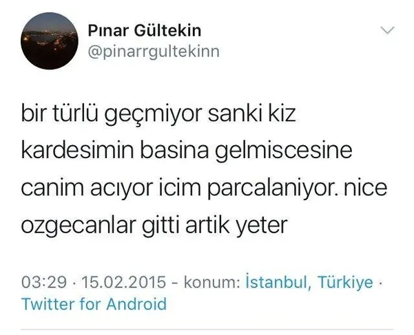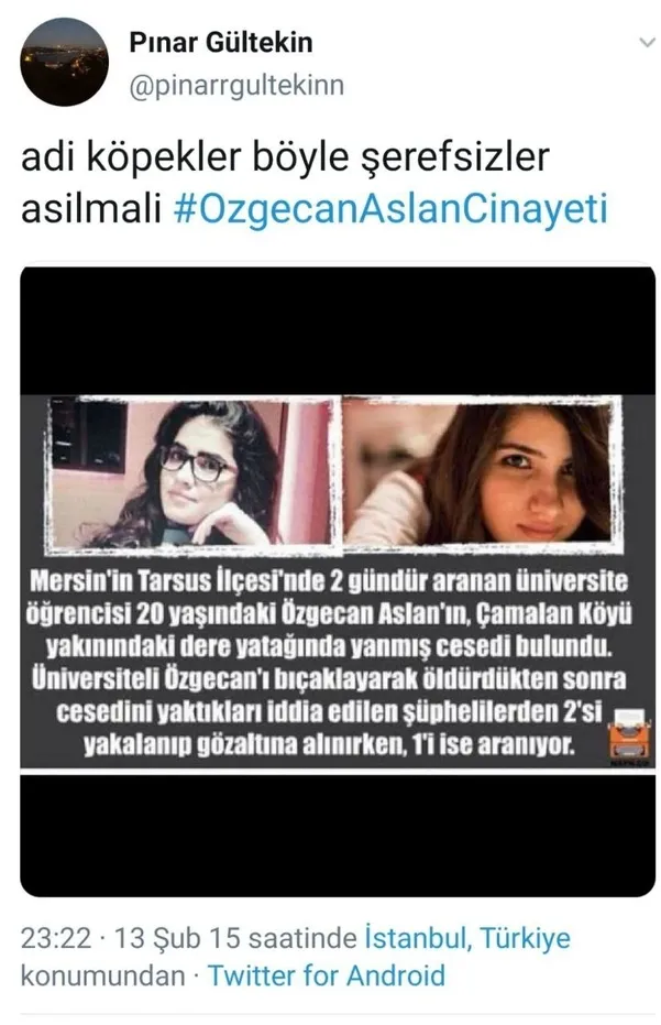 Muğla’da Cemal Metin Avcı tarafından vahşice katledilen Pınar Gültekin’in 2015 yılında yine kendisi gibi vahşi bir cinayete kurban giden Özgecan Aslan ile ilgili tweetler attığı ortaya çıktı. Gültekin’in ‘Bir türlü geçmiyor, sanki kız kardeşimin başına gelmişçesine canım acıyor, içim parçalanıyor. Nice Özgecanlar gitti, artık yeter’ diyerek acısını paylaştığı belirlendi. Sabah’tan Hayrettin Şaşmaz’ın haberinin detayları…