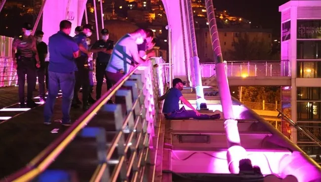 Edinilen bilgilere göre, S.S. (25) isimli bir genç, internetten tanıştığı kadının evli olduğunu öğrendiğini iddia ederek yaklaşık 5 metre köprüden kendisini aşağı sarkıttı. Alkollü olan ve yanında getirdiği bıçakla kollarını kesmeye çalışan vatandaşı gören çevredeki vatandaşlar durumu hemen 112 Acil Yardım ekiplerine bildirdi. İhbar üzerine olay yerine itfaiye, sağlık ve polis ekipleri sevk edildi. Kısa süre sonra olay yerine gelen itfaiye ekipleri, hava yastığı açarken, güvenlik amacı ile polis ekipleri tarafından yol trafiğe kapatıldı.