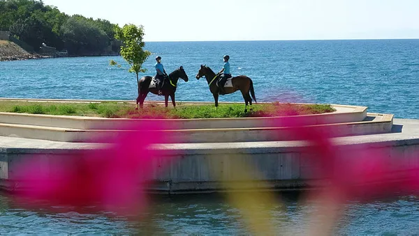 Atlı birlik, havaların ısınmasıyla oluşan yoğunluğun ardından sahil bandı boyunca devriye gezerek bölgenin güvenliğini sağlamak için görev yapıyor.