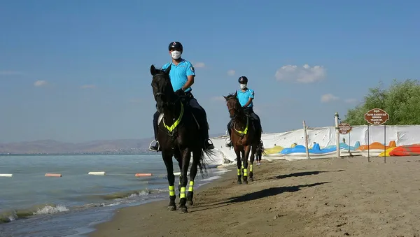 Yeni tip koronavirüs (Kovid-19) tedbirleri kapsamında vatandaşları sosyal mesafe konusunda da uyaran atlı jandarmalar, motorlu araçların giremediği Van Gölü'nün sahil bandı boyunca halkın huzur ve güvenliğinin sağlanması amacıyla devriye geziyor.