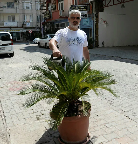 Adana'da, sokak kenarında duran 'sıkas' cinsi bitkiyi lüks araçla çalan 2 kişiyi gören iş yeri sahibi Bülent Sayılıkan, 'Güvenlik kamerası görüntülerini izleyince çok şaşırdım, 300-400 bin liralık arabayla gelip bitkimi çaldılar' dedi.