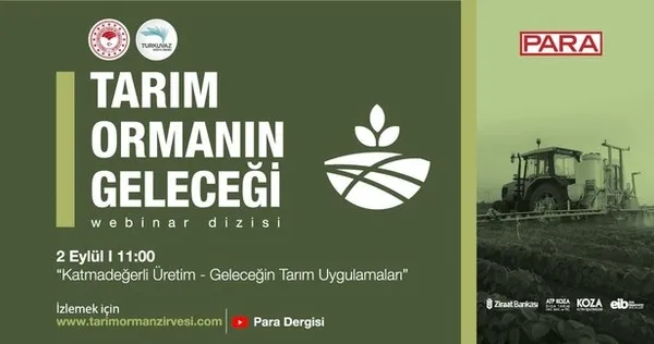 Tarım ve Orman Bakanlığı himayesinde, Turkuvaz Medya Grubu ve Para Dergisi tarafından düzenlenen 'Tarım Ormanın Geleceği Webinar Serisi ve Zirvesi' başladı. Zirve kapsamında Türkiye'de tarım sektöründe yapılan çalışmalar, belirlenen yol haritası, yeni yatırımlar gibi konular masaya yatırılacak. Üçüncü Webinar 'Katmadeğerli Üretim ve Geleceğin Tarım Uygulamaları' başlığıyla yarın gerçekleşecek.