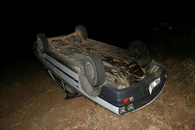06 TDE 34 plakalı Renault marke otomobil virajı alamayarak şarampole yuvarlandı ve ters döndü.
