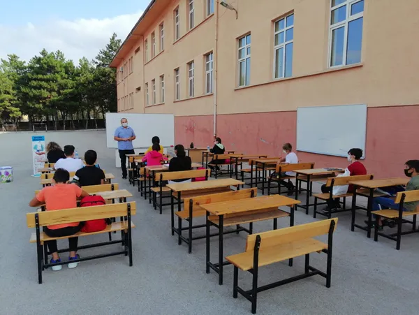 Amasya'nın Suluova ilçesinde Liselere Geçiş Sınavı'na (LGS) hazırlanan Atatürk Ortaokulu 8'inci sınıf öğrencileri için açılan kurs, pandemi dolayısıyla okulun arka bahçesinde oluşturulan açık hava sınıfında veriliyor. Öğrenci Efe Demirci, 'Hababam Sınıfı'nı hatırlatarak, uygulamadan memnun olduklarını belirtip, 'Hababam Sınıfı'ndaki Mahmut Hoca'nın 'Okul sadece dört yanı duvarla çevrili, tepesinde dam olan yer değildir' sahnesi de gerçek oldu. Bu uygulamadan oldukça memnunuz' dedi.