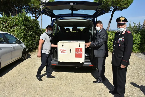 Tarihi eser, Büyükelçi Esenli, Büyükelçilik Kültür ve Tanıtma Müşaviri Haluk Söner ve büyükelçilik yetkililerince Roma Fiumicino Havaalanı'nın kargo bölümüne götürüldü.