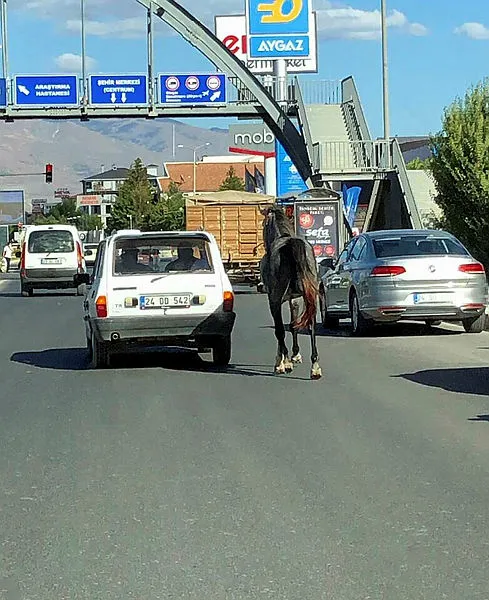 Halitpaşa Caddesi üzerinde, içerisinde iki kişinin bulunduğu 24 DD 542 plakalı otomobile ip ile bağlanan at, kilometrelerce koşturdu.