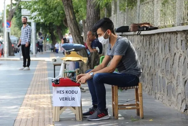 Koronavirüs tehlikesine karşı alınan son önlemlerden biri de kamu kurumlarına HES kodu ile giriş şartı oldu. Diyarbakır'da adliye önünde arzuhalcilik yapan Mehmet Ali Aslan isimli genç, bu uygulamayı geçim kaynağına çevirdi.
