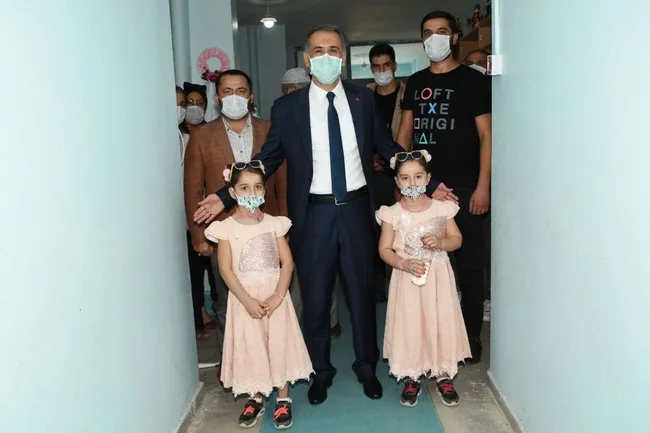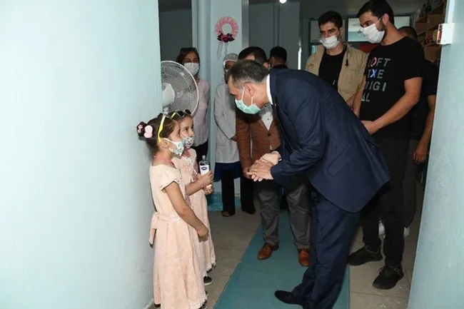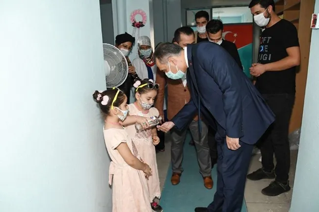 Adıyaman Valisi Mahmut Çuhadar'ı önceki gün ziyaret için gittiği Türkiye Gençlik Vakfı ( TÜGVA) Adıyaman Şubesinde bugün 8 yaşında olan Türkiye-Suriye adlı ikizler kapıda kolonya dökerek karşıladı.