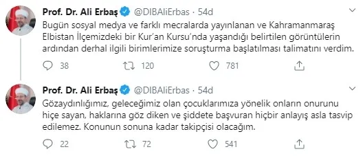 Diyanet İşleri Başkanı Ali Erbaş, Kahramanmaraş'ın Elbistan ilçesindeki bir Kur'an kursunda çocuklara şiddet uygulanan olayla ilgili soruşturma başlatılması talimatı verdiğini belirterek konunun takipçisi olacağını bildirdi.